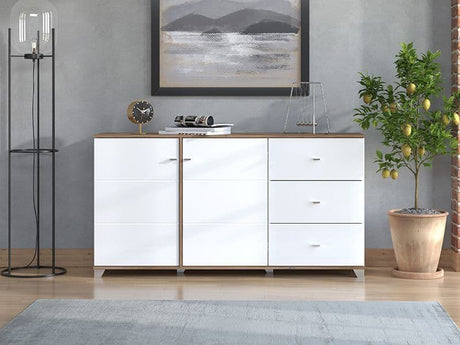 Crimson White High Gloss And Warm Oak Effect 162cm 2 Door 3 Drawer Sideboard 11012059