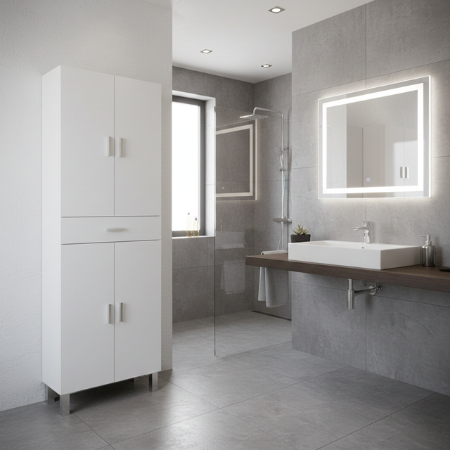 Presenting the Clara Tall White Modern Bathroom Cupboard — a sleek and functional storage solution designed to keep your bathroom organised while enhancing its modern aesthetic.