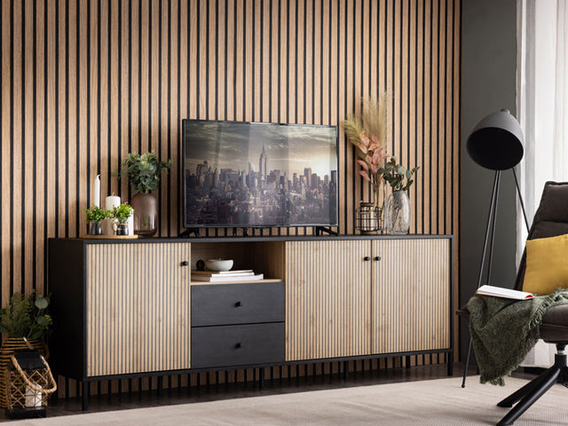 The Bevalon Slatted Artisan Oak Effect and Black Wide TV Unit Cabinet offers a perfect blend of contemporary style and practical design. Featuring a sophisticated Artisan Oak effect with sleek black accents, it brings a modern and elegant touch to any living room. Its wide 200cm frame easily supports large TVs while providing ample space for accessories. With three doors, two drawers, and an open shelf, it offers generous concealed storage and easy access to media devices. This unit is ideal for modern homes seeking both function and refined aesthetics.