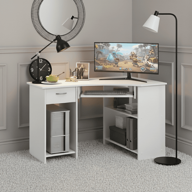 The Alexis White Corner Computer Office Desk in Alpine White is a sleek and practical solution for any workspace. It features a convenient drawer, open shelves, and a pull-out keyboard tray to keep your essentials organized and within reach. Designed for flexibility, the desk easily transforms from a corner setup to a straight configuration, adapting to your room layout and needs. Its clean white finish and streamlined design make it a stylish addition to both home offices and study areas.