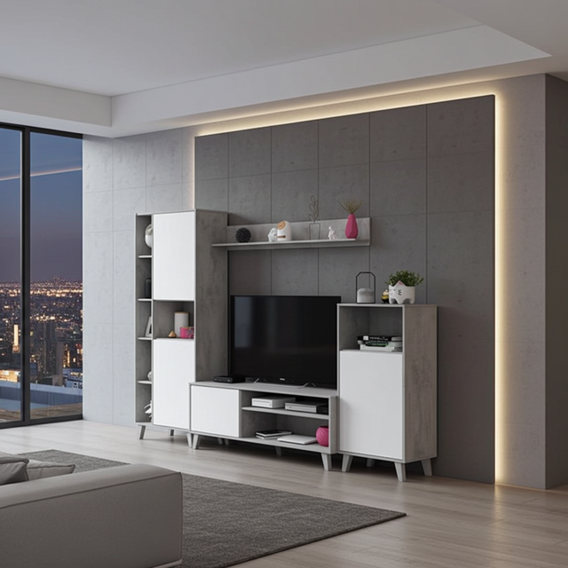 The Kenzo White and Concrete Grey Effect TV Entertainment Wall Unit combines modern style with practical storage solutions. The large central TV unit features one door and two open compartments, perfect for media devices, while the short right-side display offers one door and an open shelf for additional storage. The tall left-side display provides two doors and six open compartments, ideal for books, décor, and decorative items. Finished in a sleek white and concrete grey effect, this unit is perfect for enhancing the look of living rooms, home theatres, and contemporary interiors.